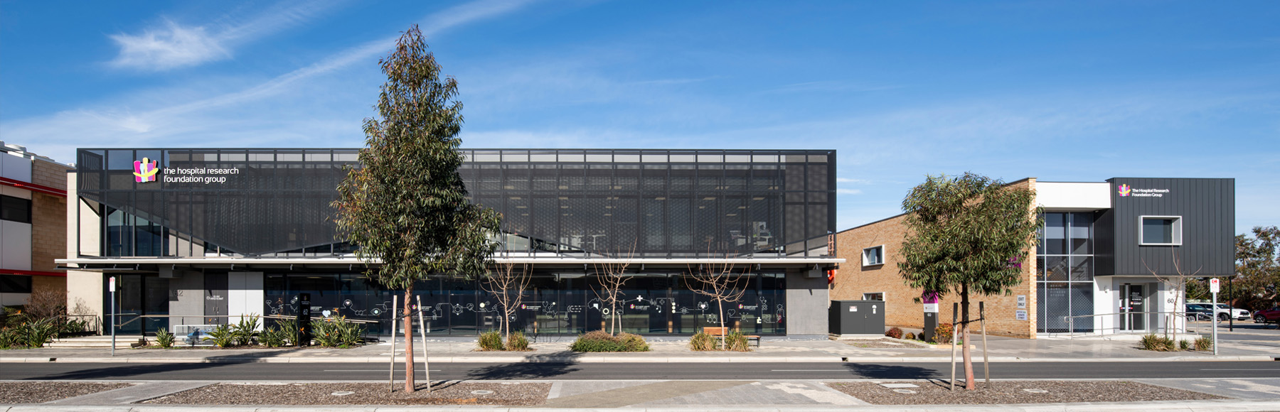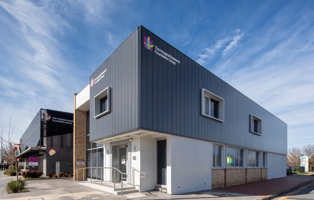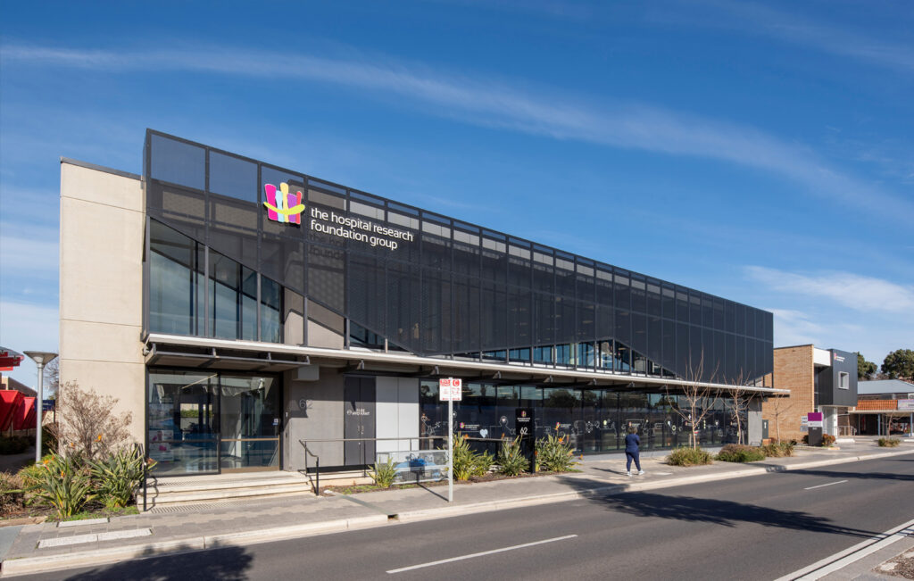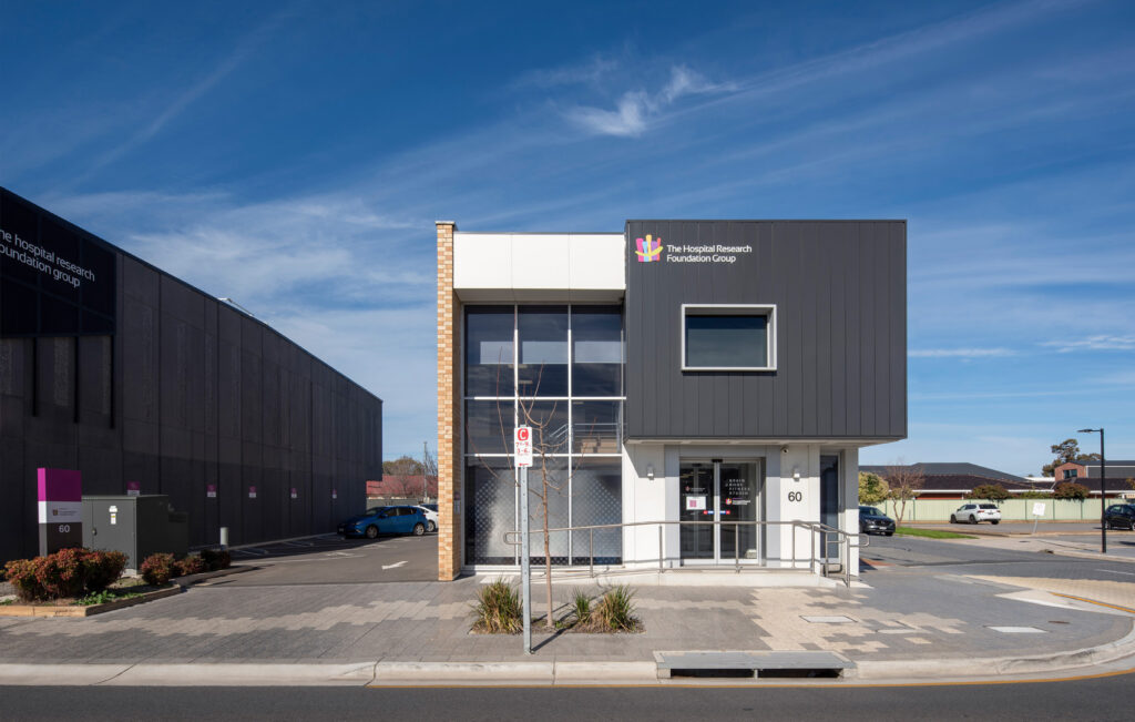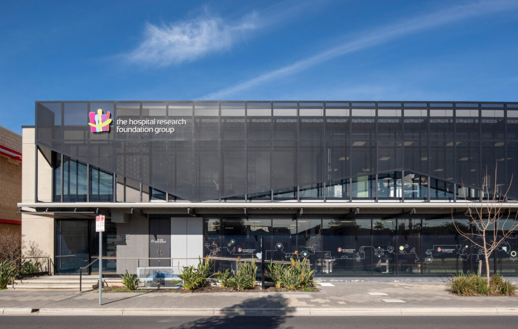 Woodville’s thriving industrial past was the reference point for designing this modern new office for The Hospital Research Foundation. The perforated metal screen in front of the full height glazing tackles the site’s orientation, solar gain, and glare control. The raking bottom edge provides a dynamic rhythm evocative of the old saw tooth factory roofs and the treatment used on the nearby Visy Glass factory on Port Road. The selected palette and materials draw from the mid-century, acting as a subtle nod to the past but used in a relevant contemporary way.