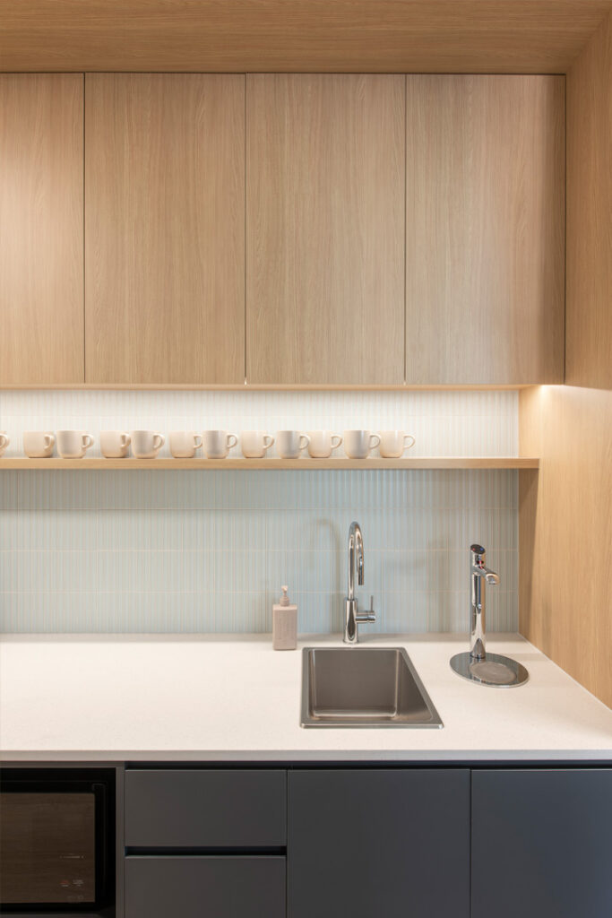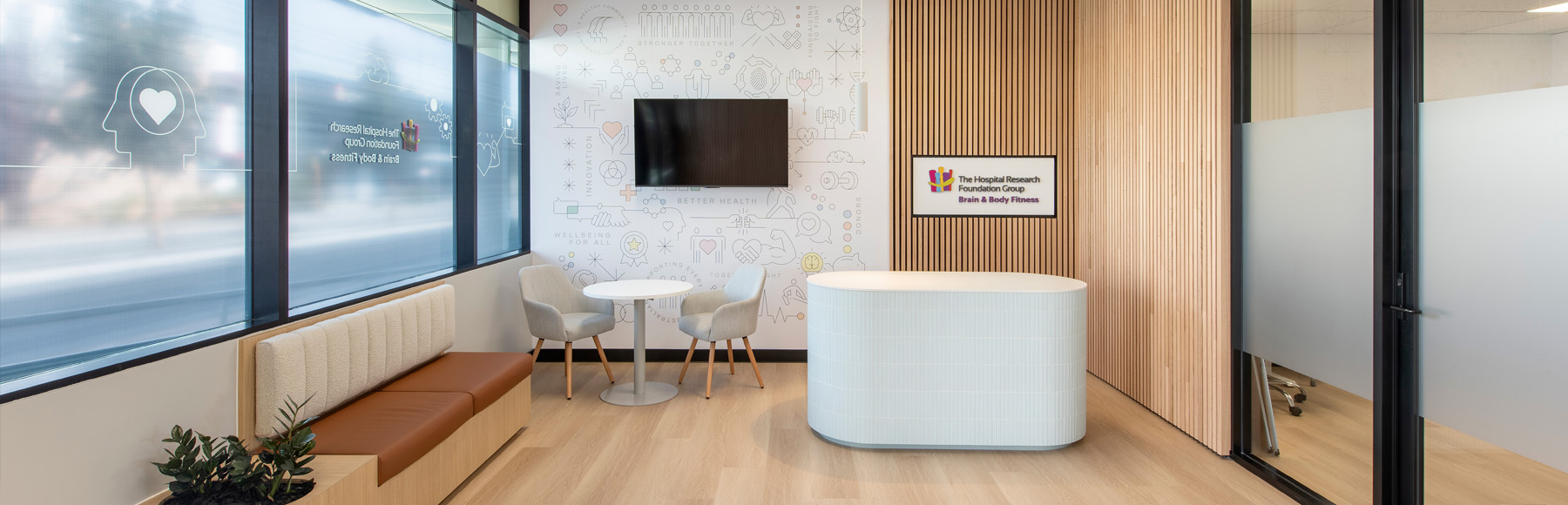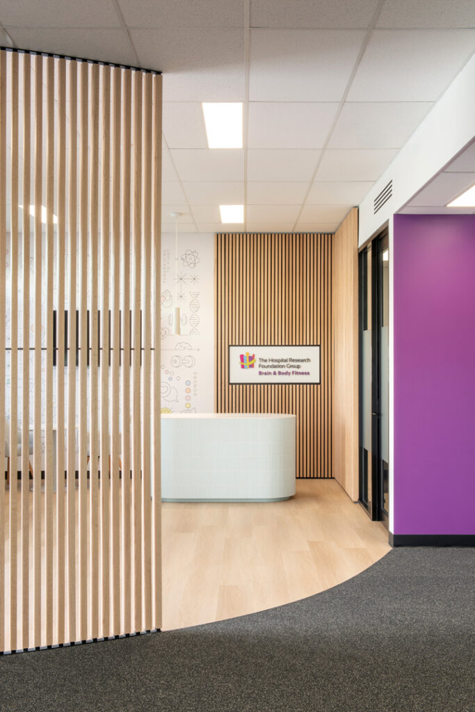 Greenway Architects was engaged to design a welcoming, contemporary space equipped with leading-edge technology. Our focus was to create an environment that encourages movement, flexibility, and cognitive engagement for people in midlife and beyond. Through thoughtful use of colour, natural materials, and spatial planning, the BBF studio delivers an engaging and interactive experience. Feature ceiling tiles, varied flooring, and curved timber screens define functional zones while enhancing privacy and acoustics.